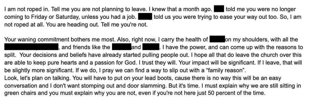 “I am not roped in. Tell me you are not planning to leave. I knew that a month ago. [Name redacted] told me you were no longer coming to Friday or Saturday, unless you had a job. [Name redacted] told us you were trying to ease your way out too. So, I am not roped at all. You are heading out. Tell me you’re not.