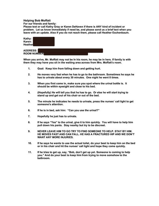 “This document was in an old email from around 2013. For context, both of Kathy’s parents were in john knox village. Her mom was very sick and needed round the clock medical care and her dad had fallen and broken his hip and needed rehab. Kathy decided that her dad needed even more round the clock care than the paid medical staff so her people put together a team of volunteers to sit with her dad 24/7 for 3-4 weeks with their main responsibility being to help him pee. I was one of the lucky chosen. Here are the rules we were given.”
